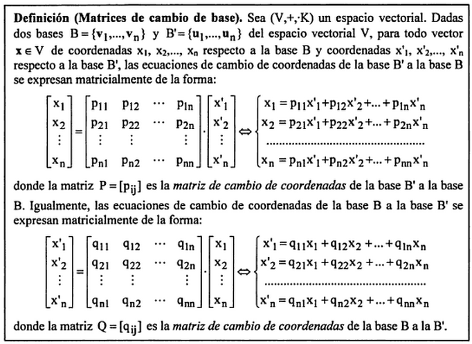 Cuando tenemos dos bases podemo calcular cómo pasar de las coordenadas de una base a la otra. Para ello utilizamos la matriz del cambio de base.